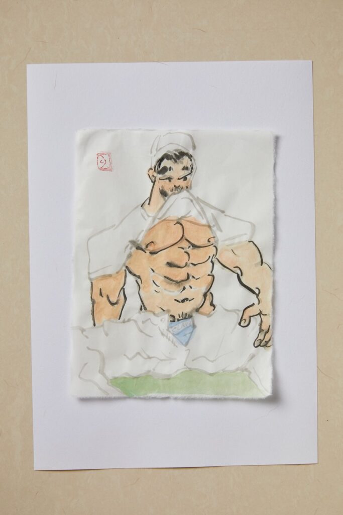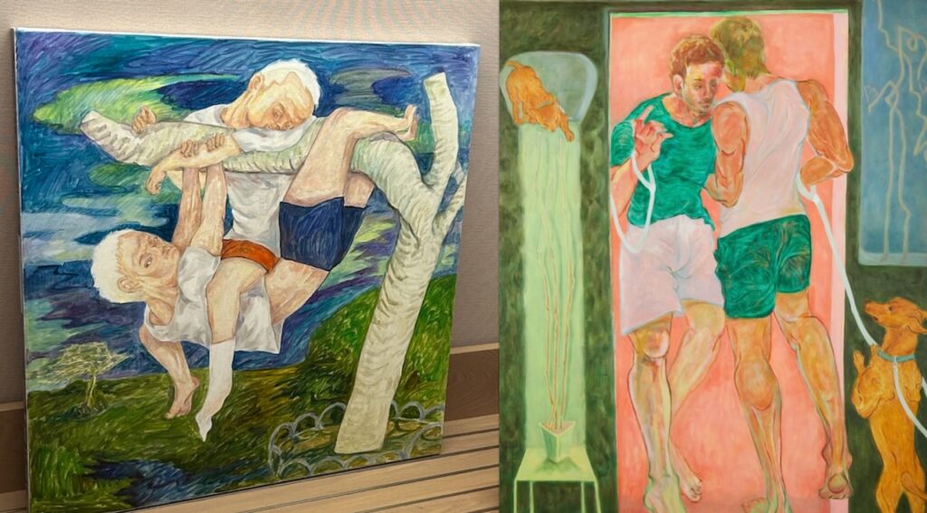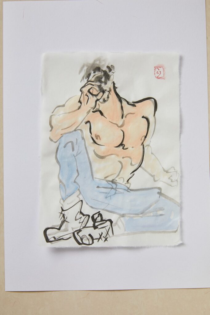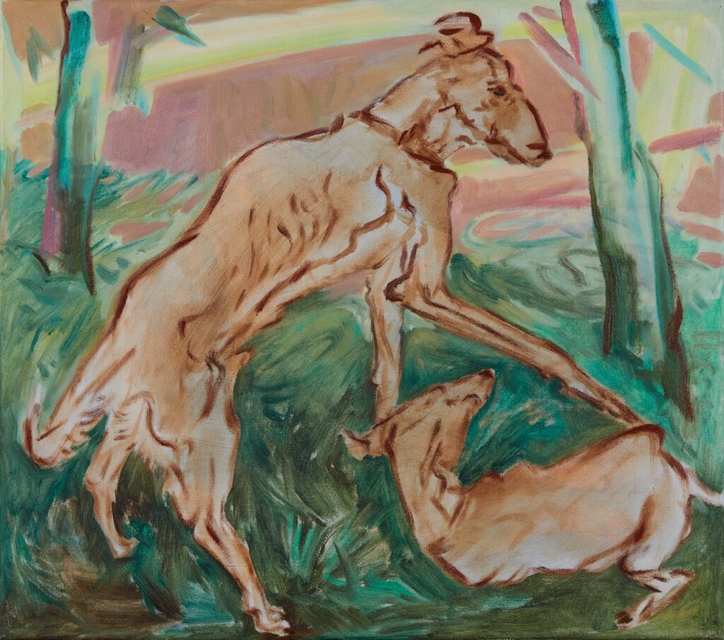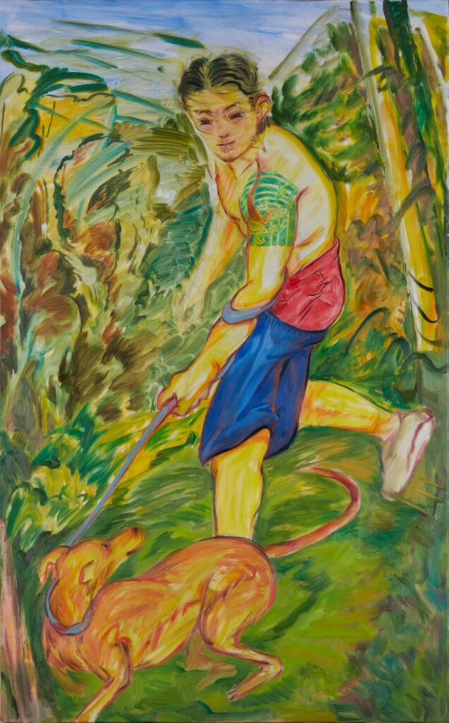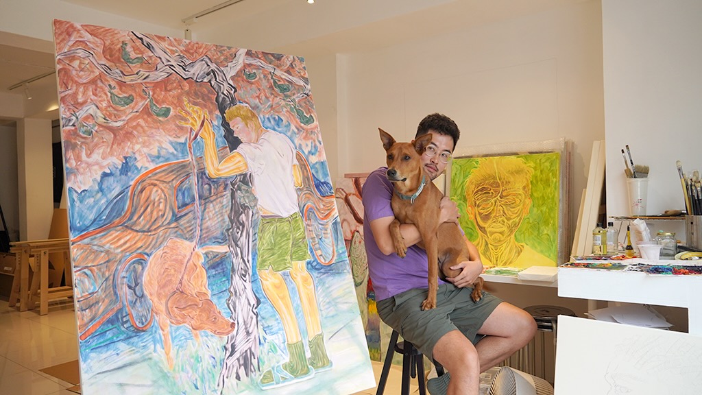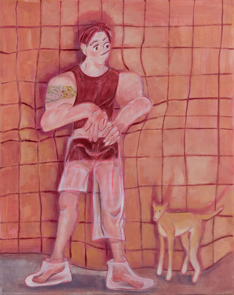 紀少淵,1995年出生於台中,2023年取得東海大學美術系碩士學位。創作以油畫為主並加入水墨語彙融合其中,關注人與人之間的情感流動,特別是男性間的隱密情感與人與狗的貼近生活互動。