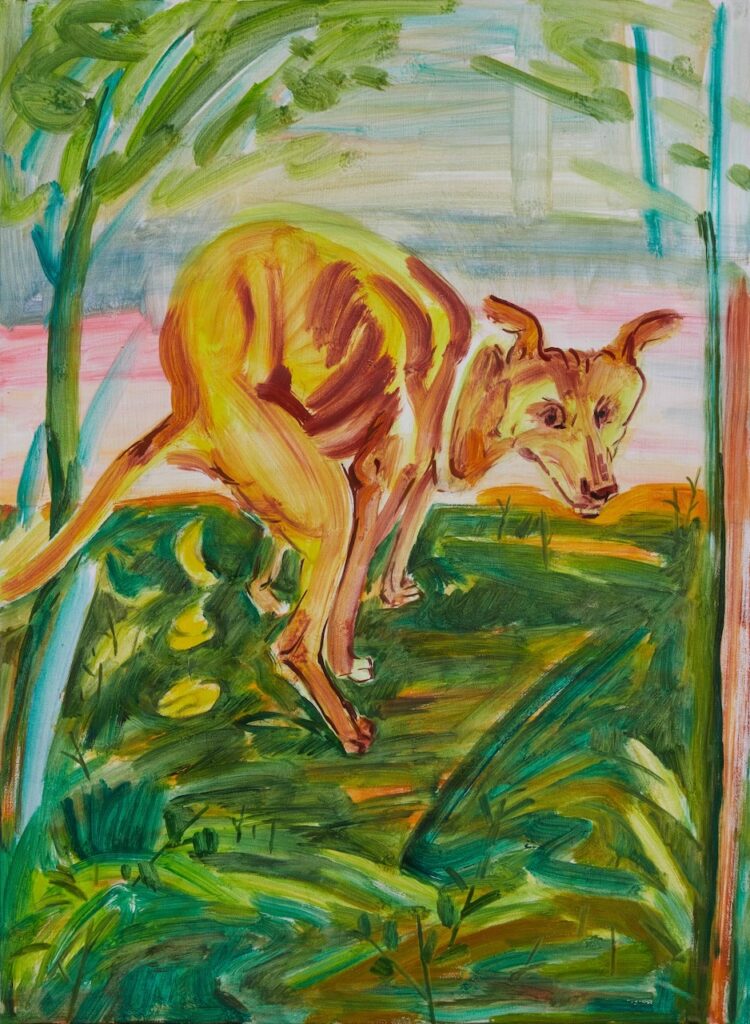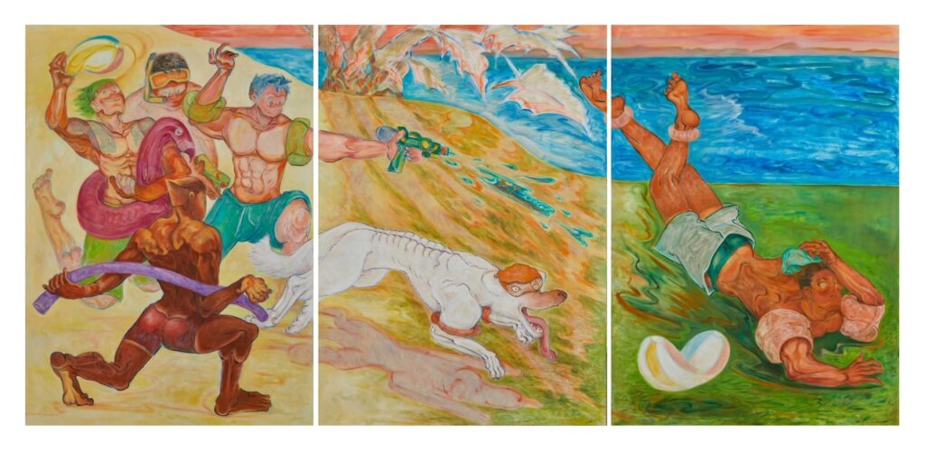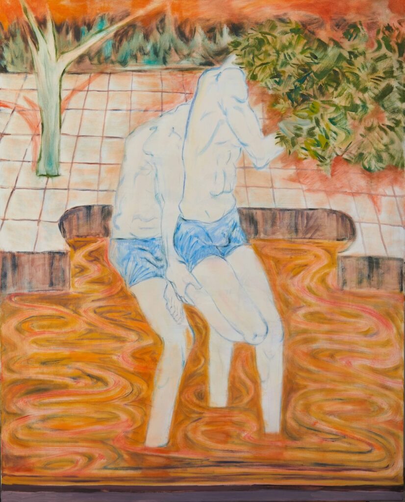 使用接近純色的對比色系,試圖在平面的畫布上製造動態感。那些在畫面中出現的人事物,都處在一個,變動的狀態,在這樣的氣氛裡,複雜的人性與情感藏在畫面之中,找尋存在與關係的遊戲。