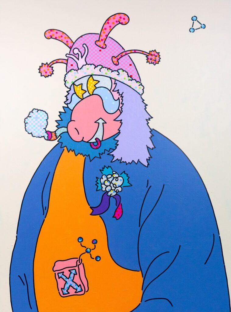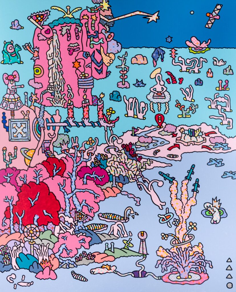 亦開創了名為「New Boi Paradise」(NBP)的宇宙觀。NBP宇宙結合東西方文化、現代流行、心理學與次文化現象,創造出富有象徵性與故事性的無限繁殖場域。NBP並非一個脫離現實的幻想國度,而更像是藝術家對於當代社會、性別議題、以及人性本質的一場持續辯證與實驗。同時作為亞洲潮流語彙的邊界實驗,在抽解當代與預言未來的縫隙之間、身份與慾望的交叉地帶,用藝術語彙召喚出屬於當代亞洲少數者的抵抗革命。在他的筆下,每一幅作品都像是帶領觀者透視日常現實與超現實之間界線的窗口,挑戰我們習以為常的身份觀念,重新詮釋人性中的複雜性與純真本質。